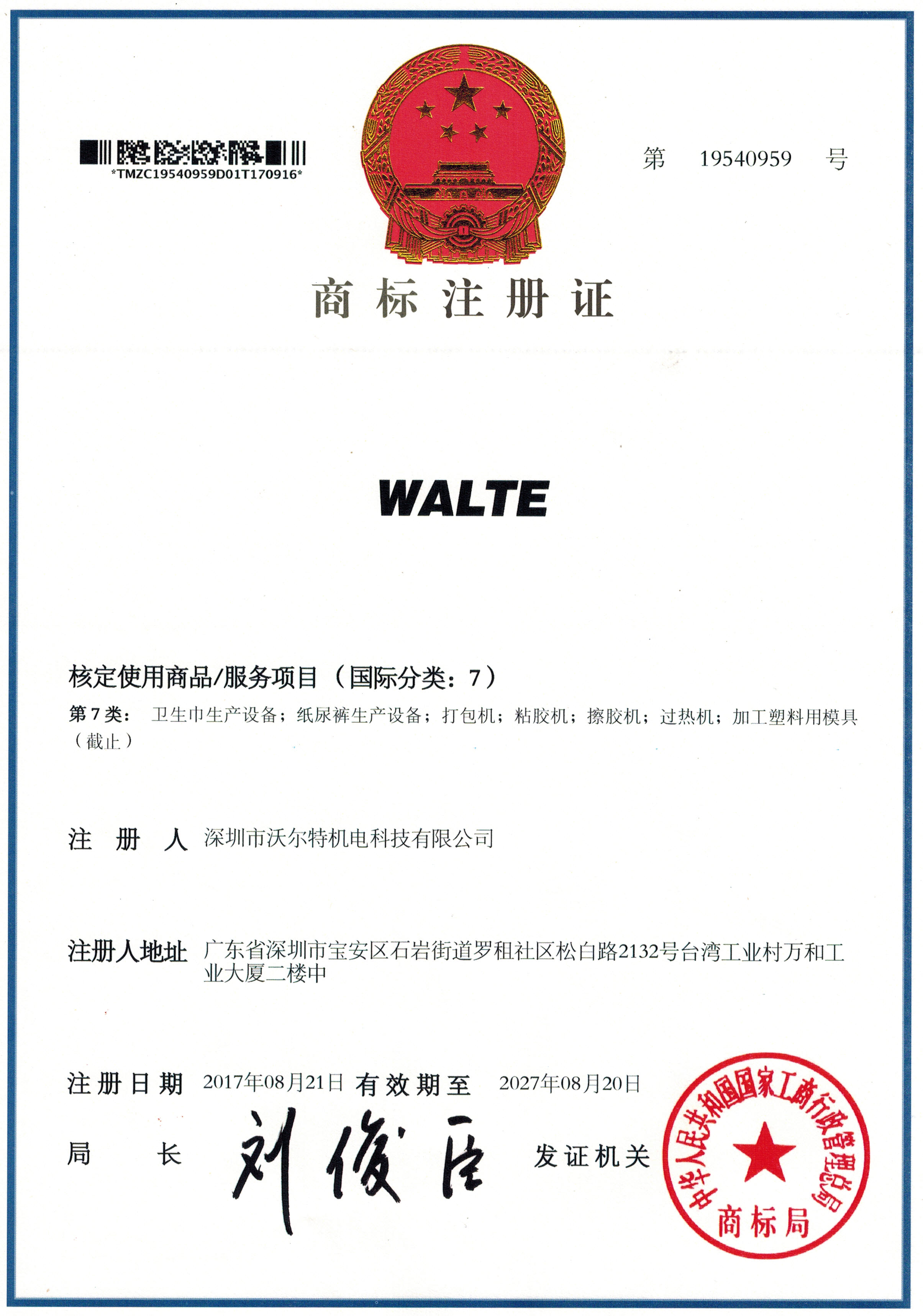沃爾特 Walte 商標證書
